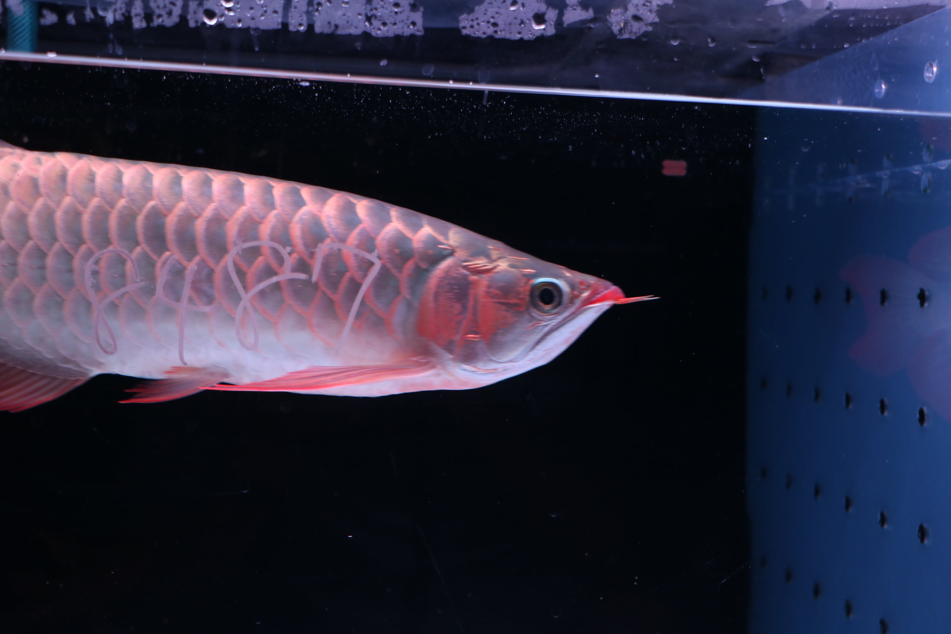 メタリックな鱗もますます光沢が増してきました。頬の発色もいよいよ始まりましたので全体が赤く色づいてくるのも楽しみです。ノーマルタイプと比べると全然スタイルが違いますので、サイズや迫力を重視される方や、鑚石背鱗の珍しさもお気に召して頂けましたら間違いなくオススメの一体です!一匹限定です。ほんのほんの少しセミショート気味?!いやほぼ普通スタイルにもみえます。これもまた特徴的です!