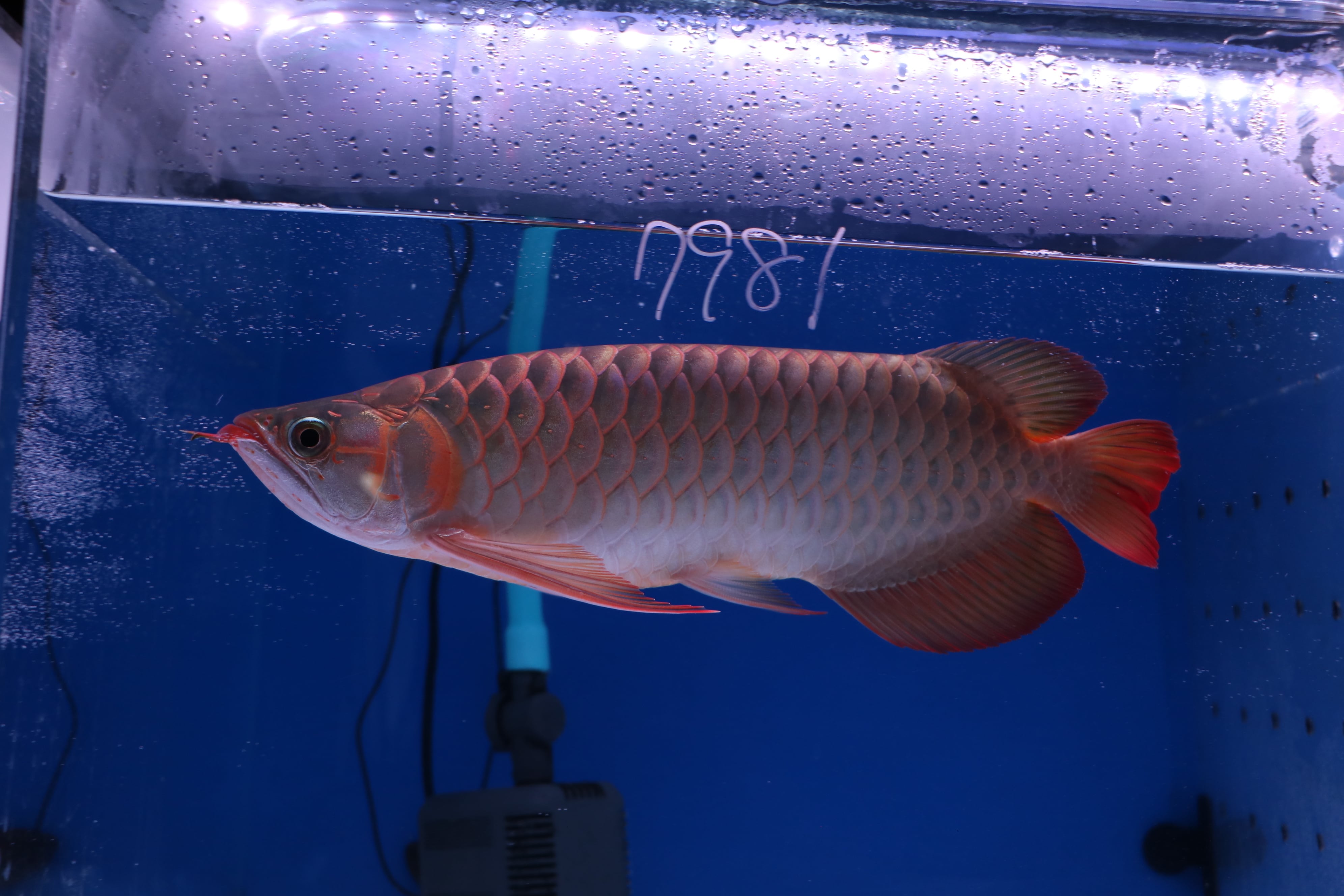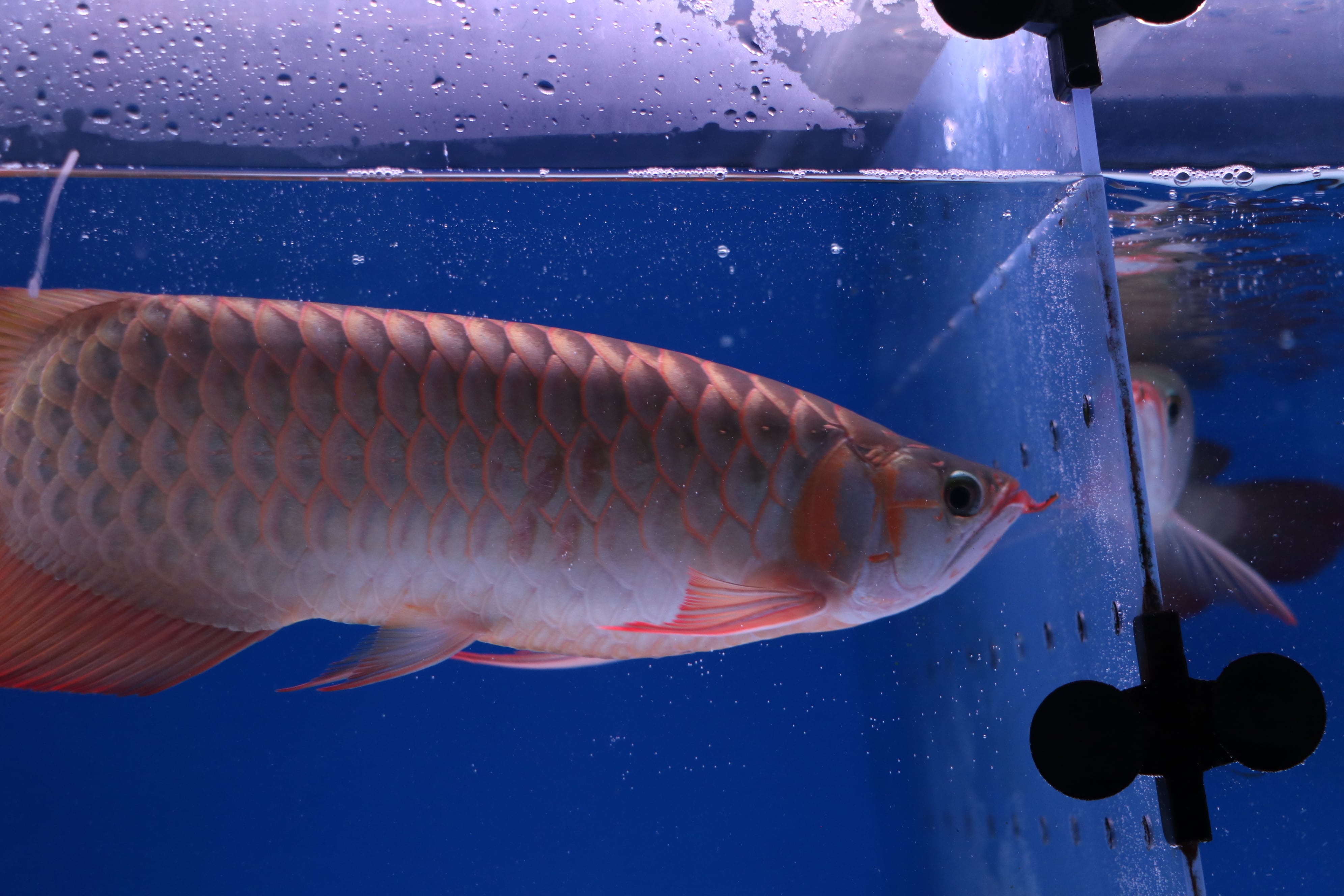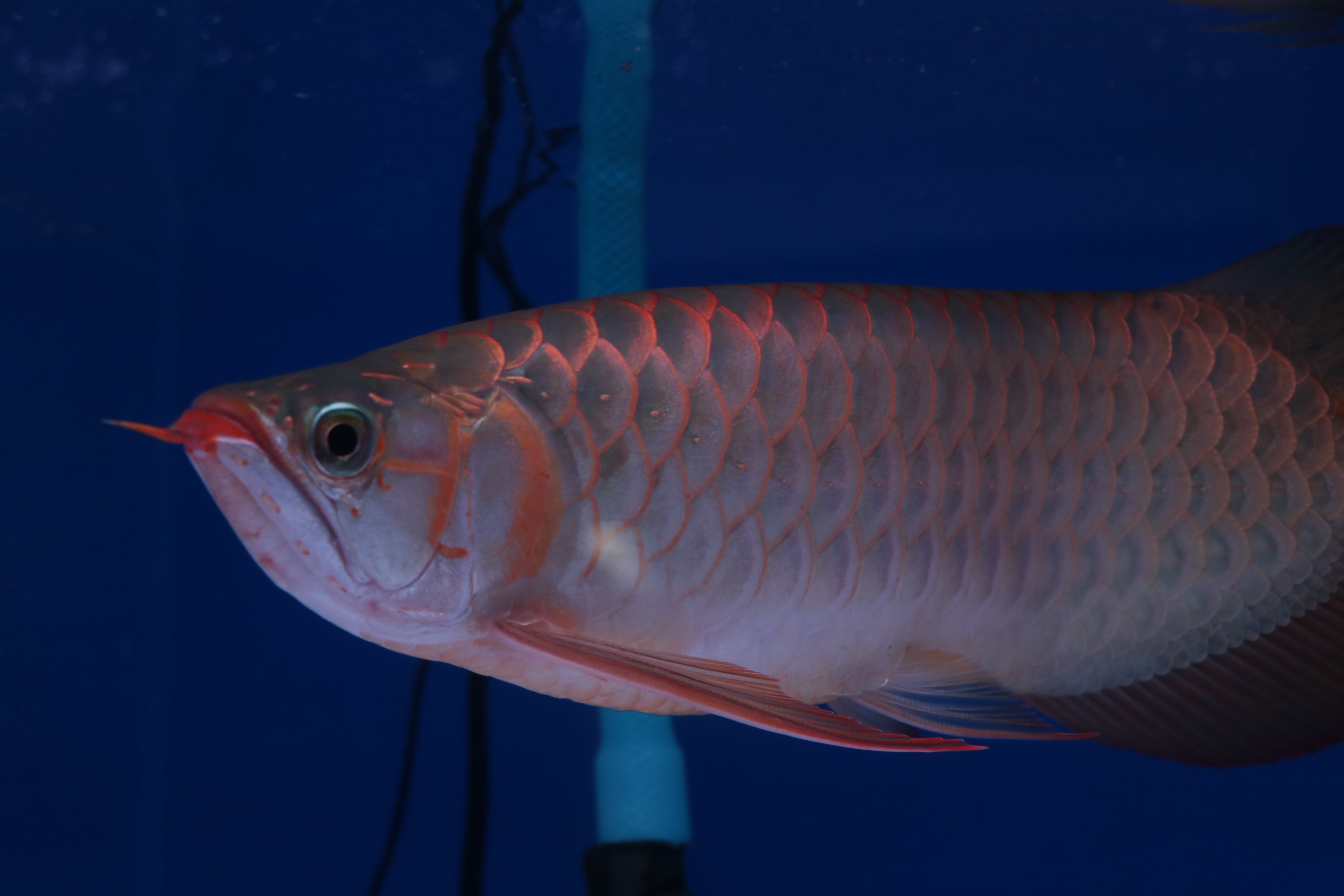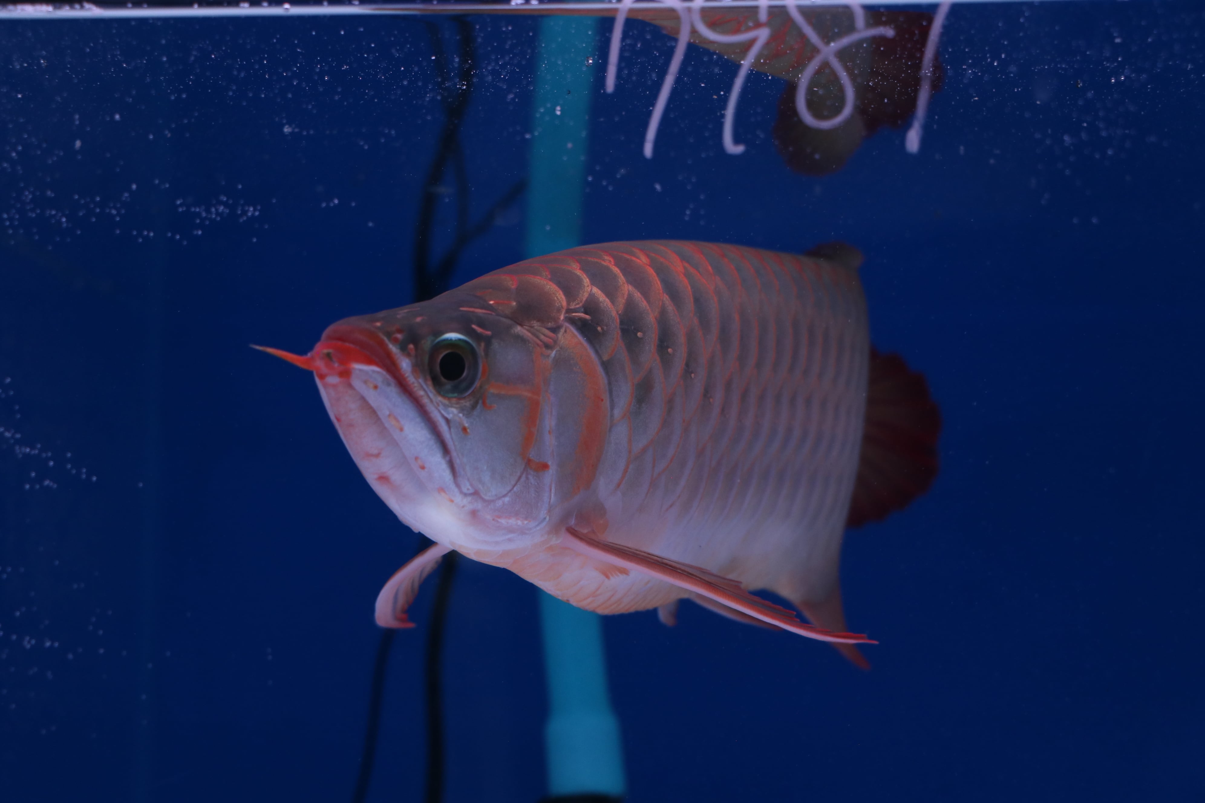 ハイボディでロングフィンの美しいアロワナ。発色が早め目でテンニングなくても発色してきます。餌食いもよくサイズアップも大きく期待できそうです。目だれありと、右体側に一時的なケガありのため特価です!