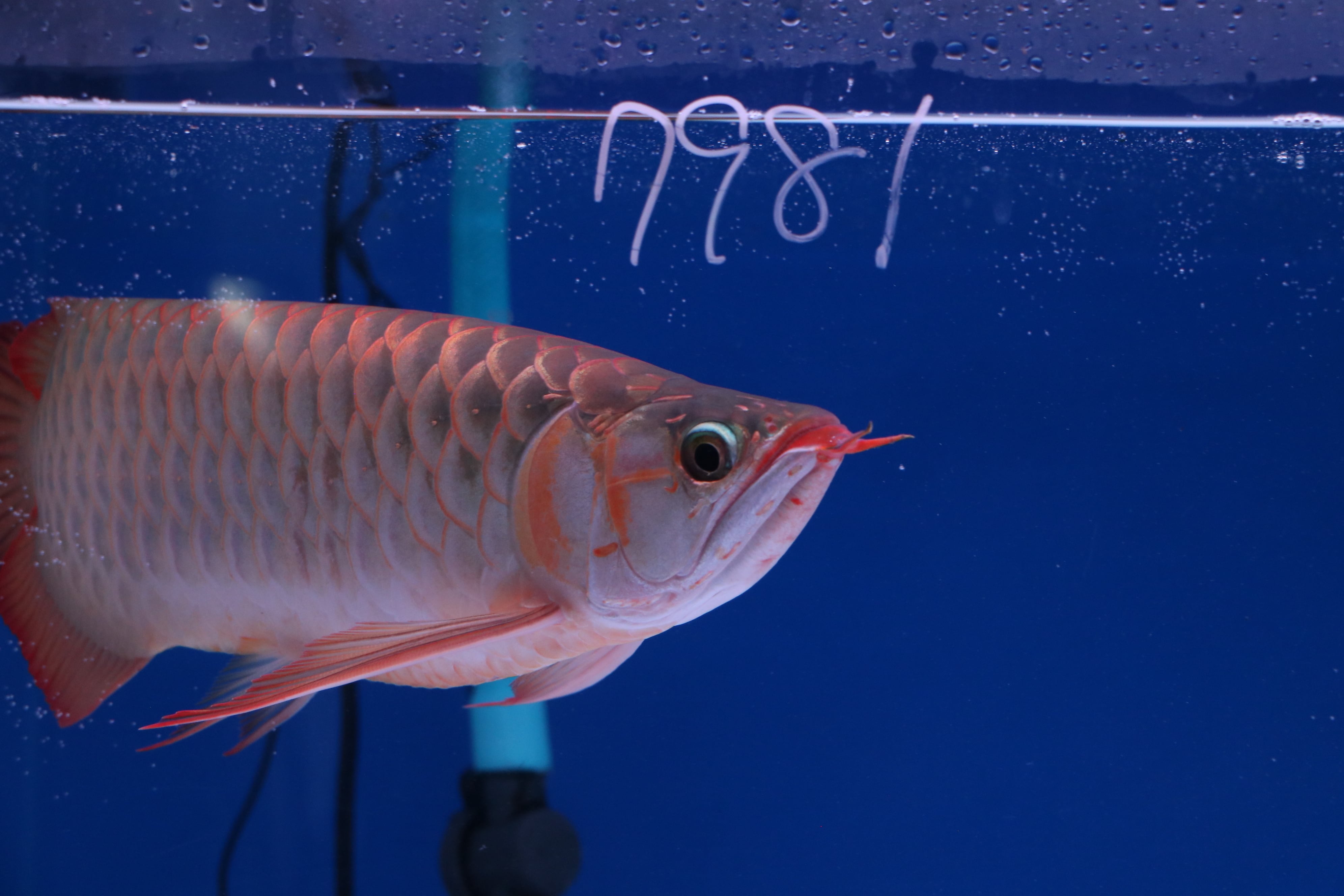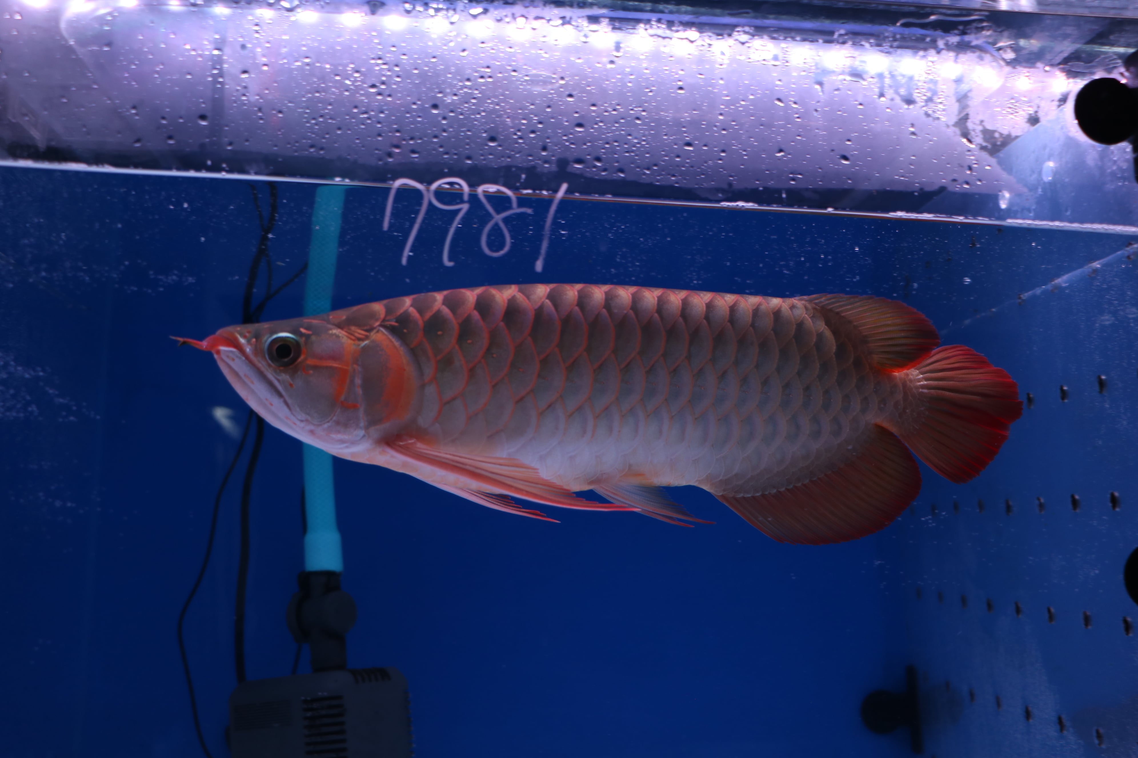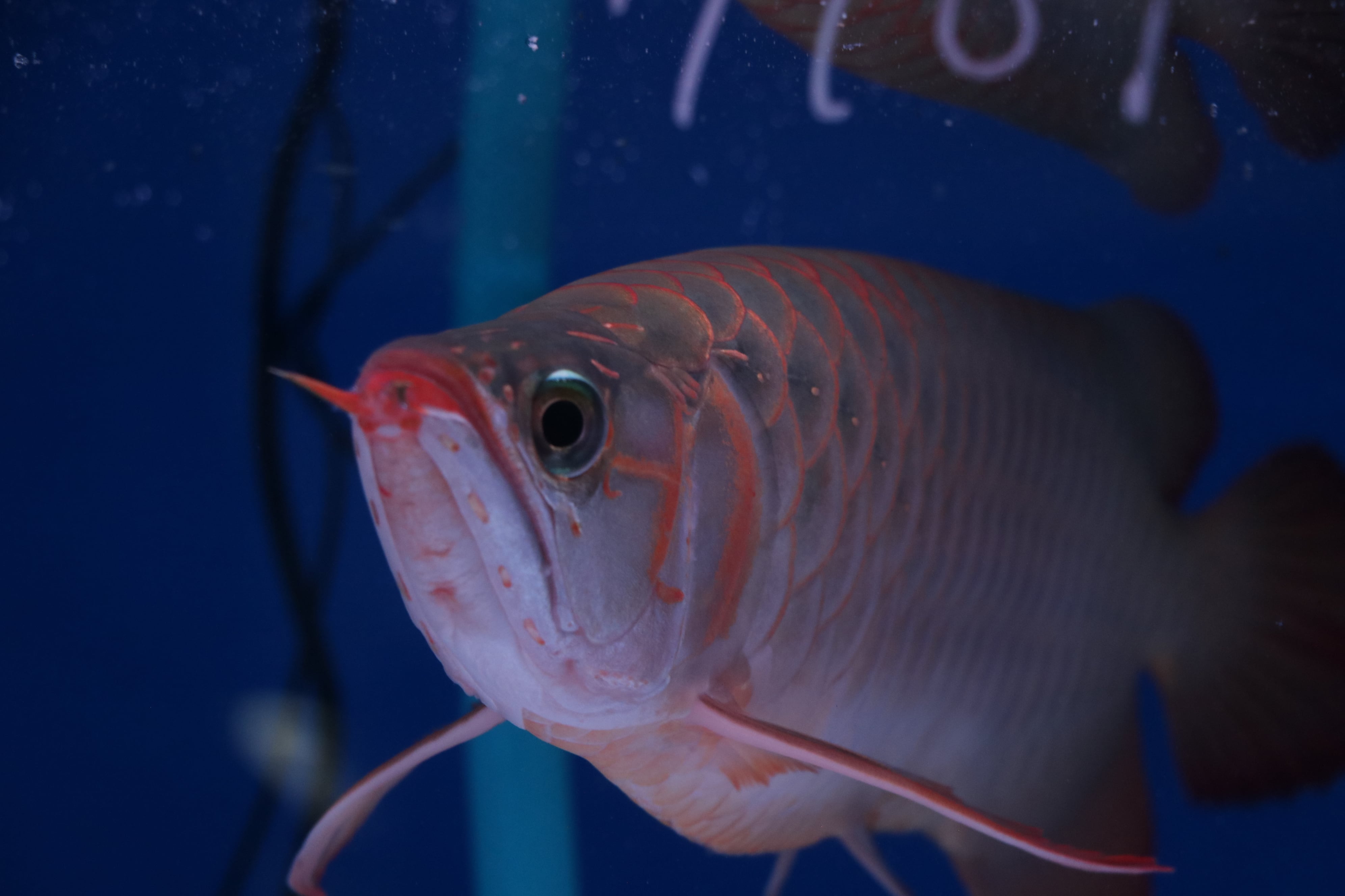 ハイボディでロングフィンの美しいアロワナ。発色が早め目でテンニングなくても発色してきます。餌食いもよくサイズアップも大きく期待できそうです。目だれありと、右体側に一時的なケガありのため特価です!