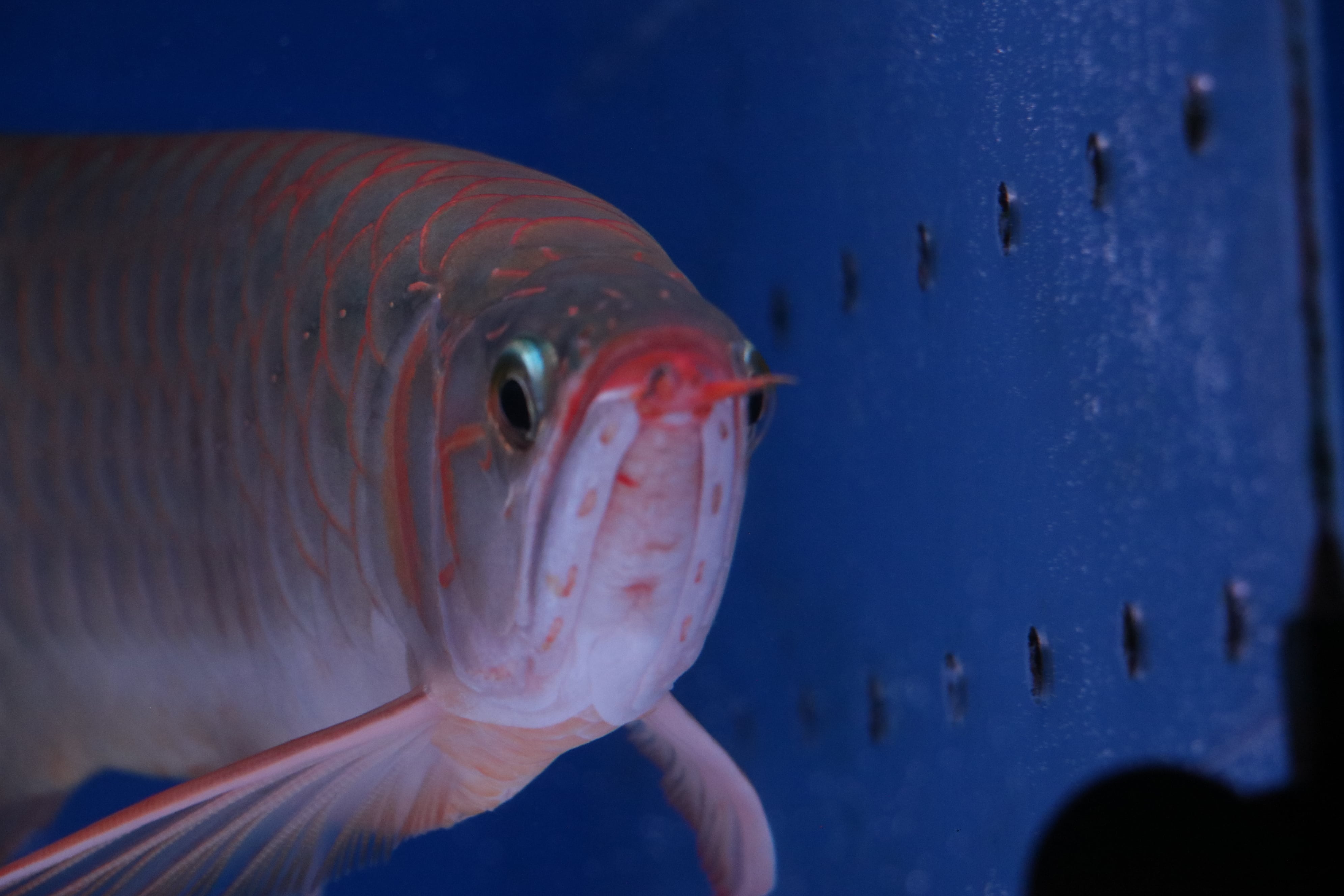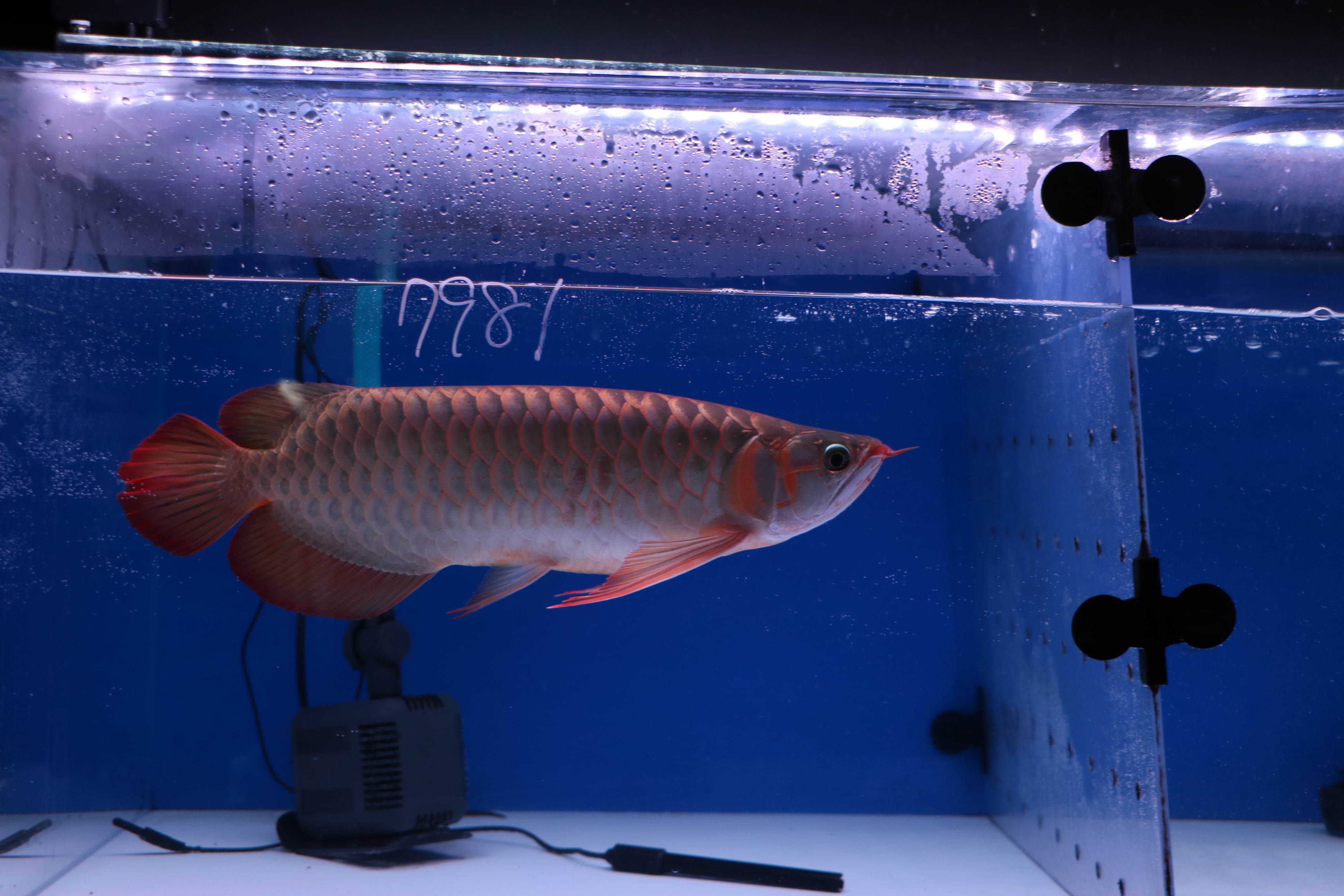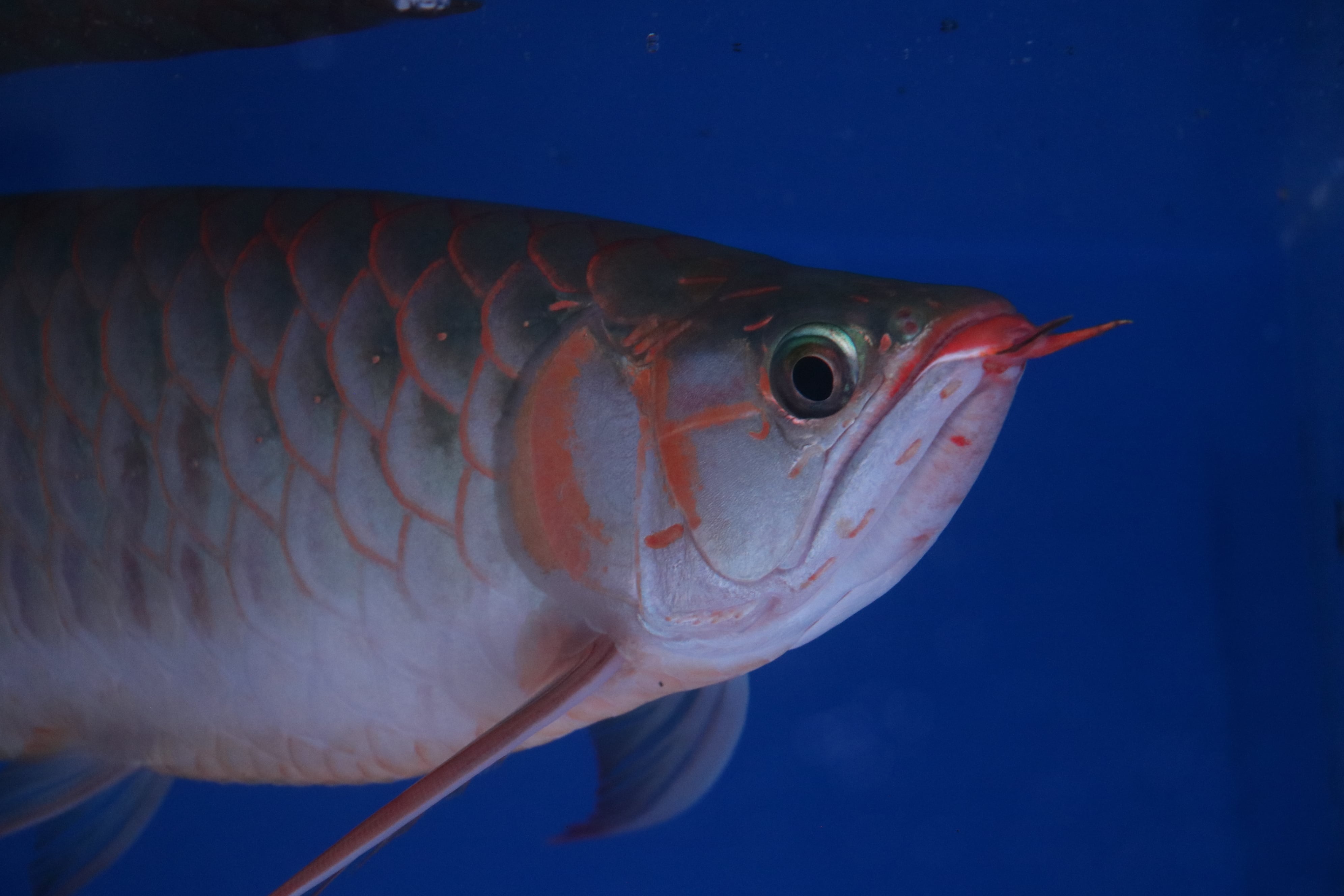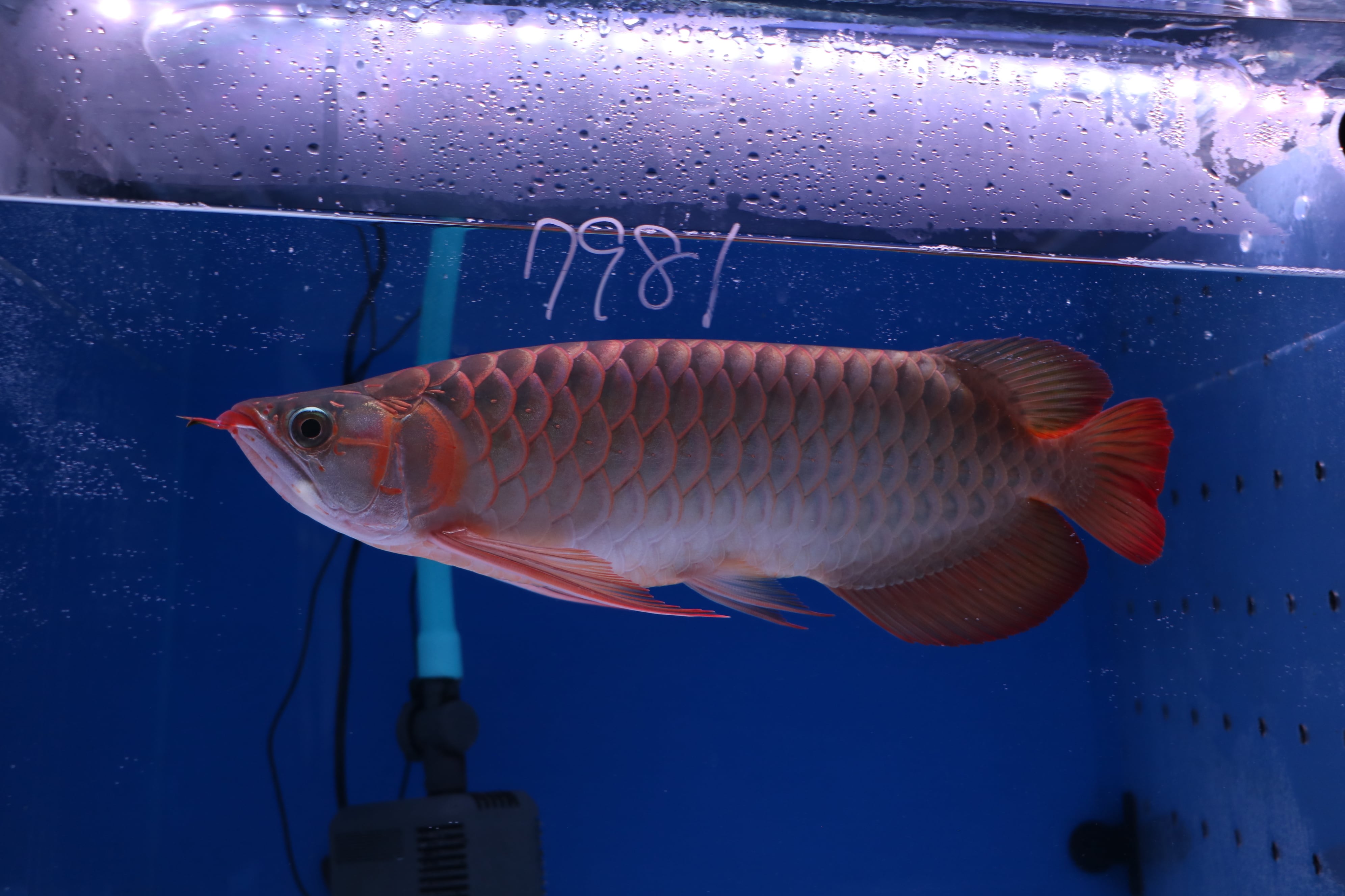 ハイボディでロングフィンの美しいアロワナ。発色が早め目でテンニングなくても発色してきます。餌食いもよくサイズアップも大きく期待できそうです。目だれありと、右体側に一時的なケガありのため特価です!